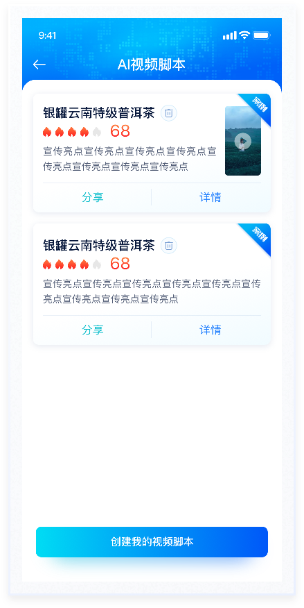 AI生成視頻腳本是用戶輸入相應(yīng)條件后,AI大模型通過系統(tǒng)算法生成視頻內(nèi)容。整體風(fēng)格較為科技感,因此在配色上使用藍(lán)色漸變及較重投影,符合產(chǎn)品屬性,能夠突出產(chǎn)品的創(chuàng)新性和先進(jìn)性。使用戶在使用過程中感受到強(qiáng)烈的視覺沖擊和沉浸感,這種體驗(yàn)有助于增強(qiáng)用戶對(duì)產(chǎn)品的興趣。