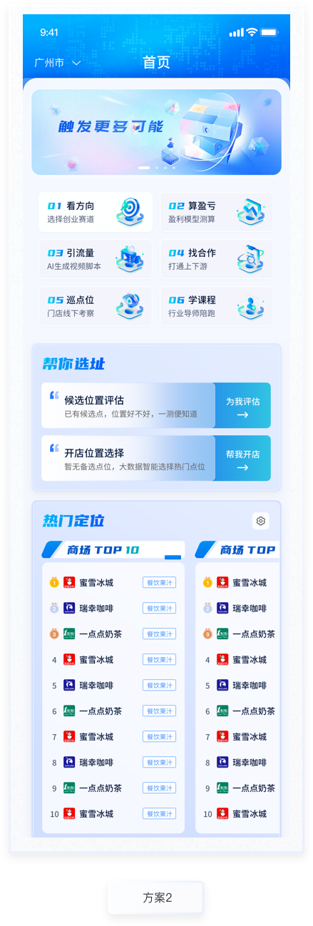 所盈利測(cè)算功能是產(chǎn)品的主要功能,通過AI對(duì)未來開店盈虧情況進(jìn)行預(yù)測(cè)評(píng)估。本次設(shè)計(jì)主要優(yōu)化該流程的交互及視覺表現(xiàn),整個(gè)流程分為“成本結(jié)構(gòu)”“收入結(jié)構(gòu)”“經(jīng)營測(cè)算”三個(gè)階段,過程填寫情況放置在頁面頂部,一步了然。已填寫使用主題色標(biāo)注,未填寫則使用置灰顏色處理,符合用戶基本感知。按鈕使用與主色相近的漸變色。