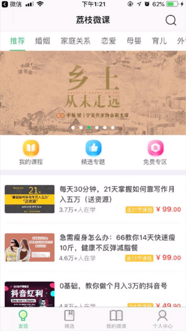 3.中間以三個圖標(biāo)按鈕表示我的課程,精選專題,免費專區(qū)快捷入口方便用戶來回 切換;
